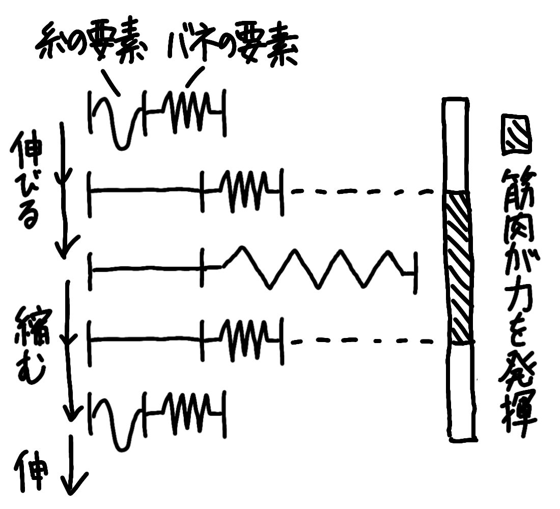 今度は筋肉が伸びて縮むときのバネの要素と伸び縮みしない糸の要素の動きを見ていきましょう。