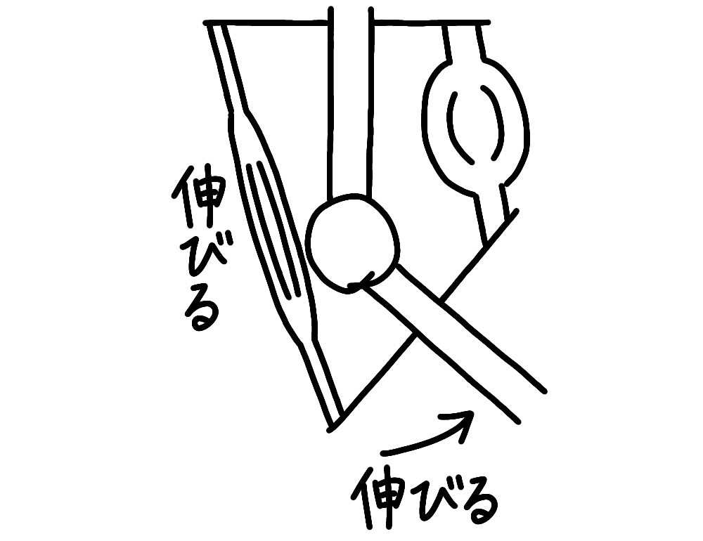 1.関節が曲がっていると曲がった方とは反対側の筋肉が伸びます。
