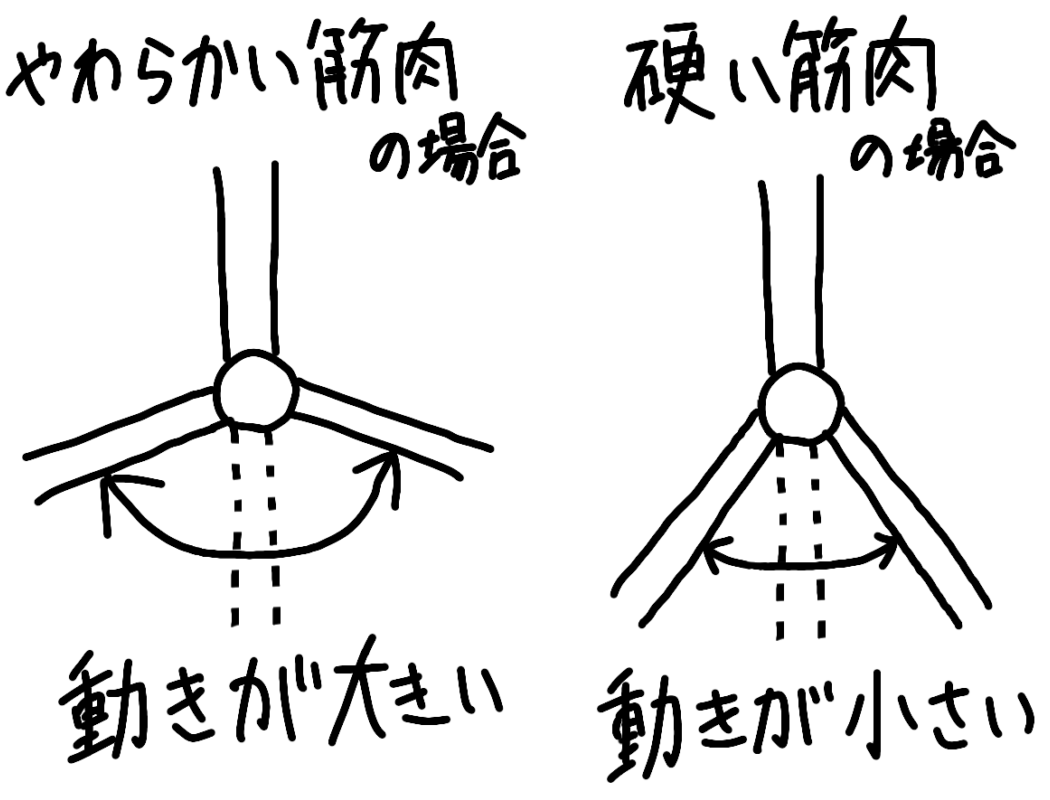 やわらかい筋肉では関節が大きく曲がる・大きく伸びることになり、全体の動きも大きくなります。