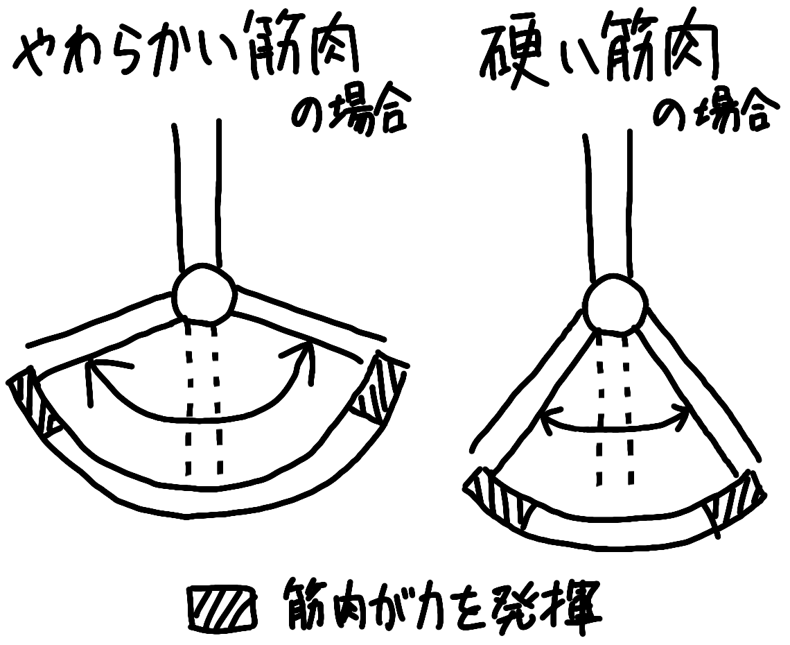 筋肉は伸びたときに縮もうとする力を発揮する。硬くて長く伸びない筋肉だと伸びる&縮むの間隔は短くなる。間隔が短くなればそれだけ筋肉が力を発揮できる時間の割合が増えるということだ。
