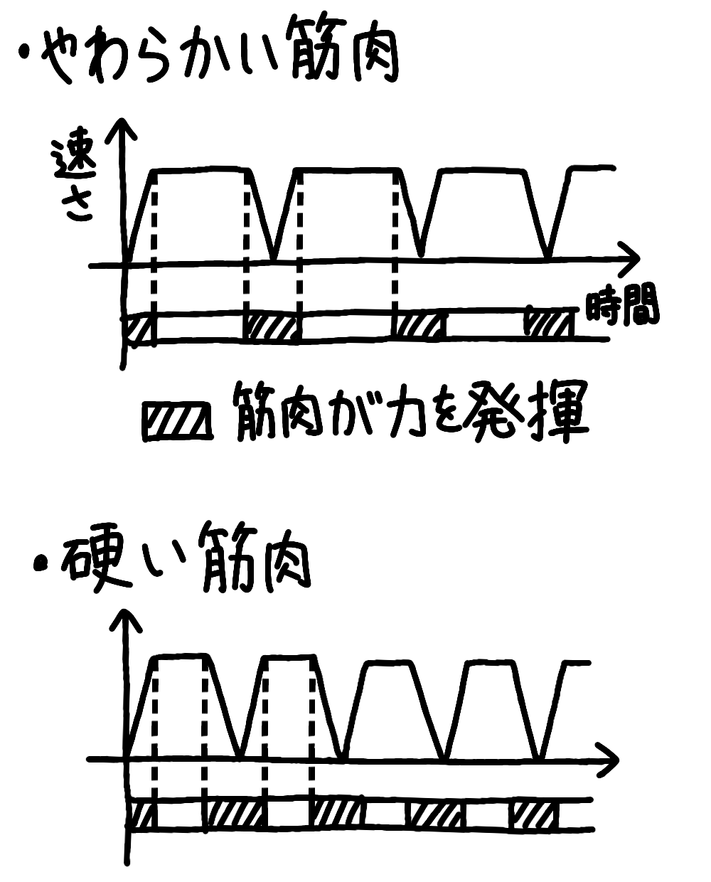 しかしやわらかい筋肉は、動きの中で筋肉が力を発揮する時間の割合は小さくなります。