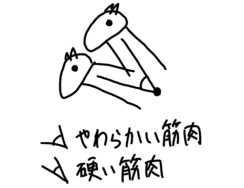 推進力を最大にさせるにはやわらかすぎず、硬すぎず、ちょうどいい筋肉が理想となる。ただ別にやわらかいとダメ、硬いとダメではない。やわらかいほどいい、硬いほどいいというわけではないということ。前にも言ったが。