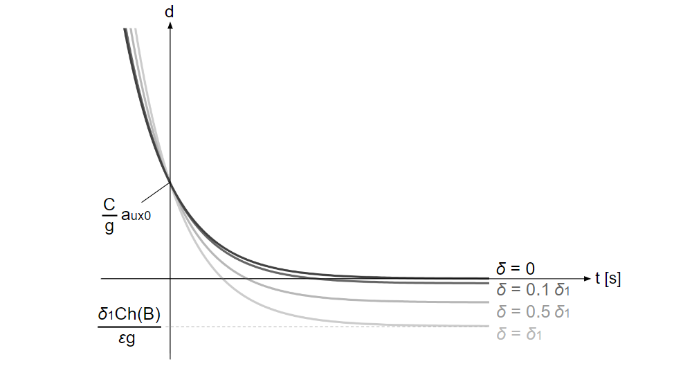 \(d(t)=\displaystyle \frac{C}{g}a_{ux}(t)=\displaystyle \frac{C}{g}(a_{ux0}e^{-εgt}-\displaystyle \frac{δh(B)}{ε}(e^{-εgt}-1))\)