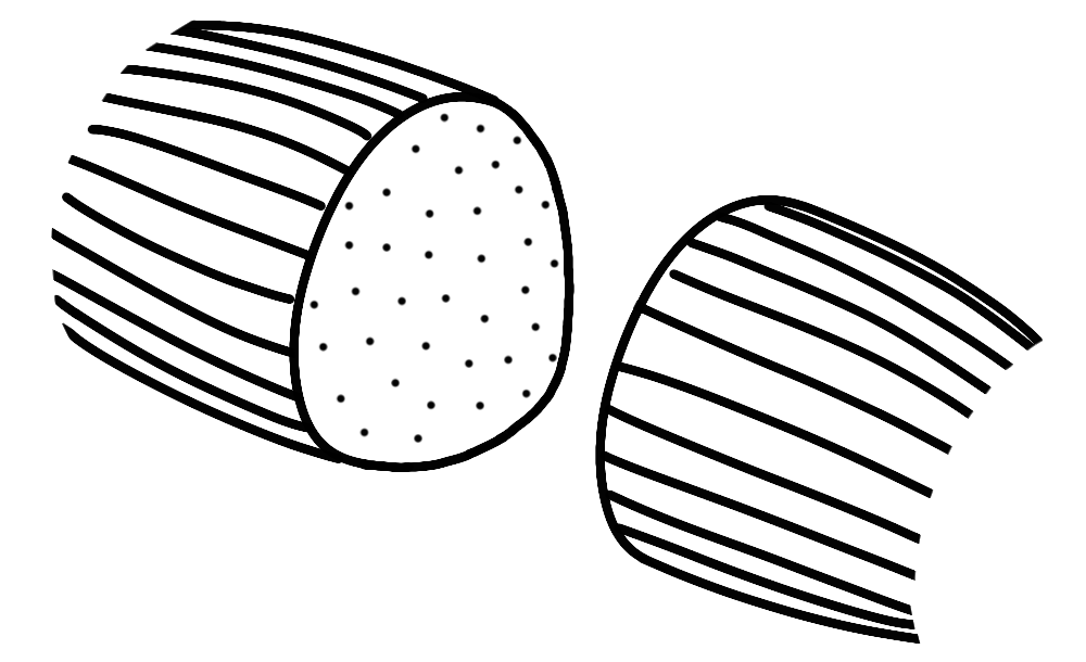 本当はこの応力とひずみをちゃんと計算しないと研究者として失格ですが、私の知識ではできそうにないので、簡単な脳内シミュレーションと観測した結果から導いた、現時点での結論を書きます。(まあ計算は誰でもできますしね。重要なのは、芯があることで断面の形が変わるという「天才的な?」アプローチです。このアプローチさえ合っていればこの後に書いてある現時点での結論が間違っていてもいいんです。)