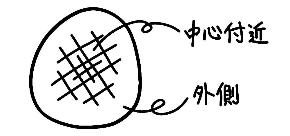 もう少し詳しく言うと、筋線維に対して垂直な面で筋肉を切ったときの断面を考えます。筋肉増強剤を十分な量使用している筋肉は、この断面における筋肉の中心付近と外側とで、その性質が明確に違ってくるのです。
