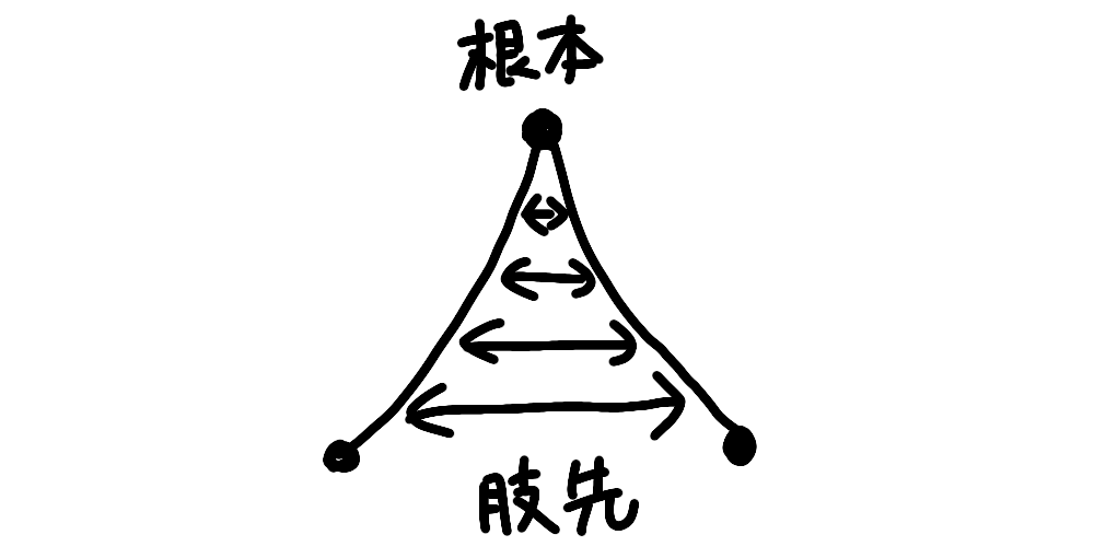 肢の根本に近い部分の角度の変化が大きく、肢先に近い部分の角度の変化が小さい