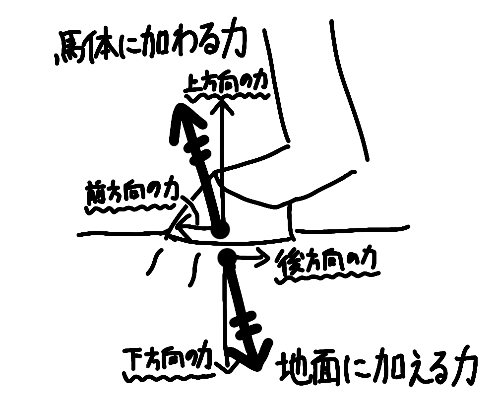 地面に加える力ですが、これは「後ろ方向の力」と「下方向の力」の2つに分けることができます。地面から馬体に加わる力の場合は、その反対の「前方向の力」と「上方向の力」になります。