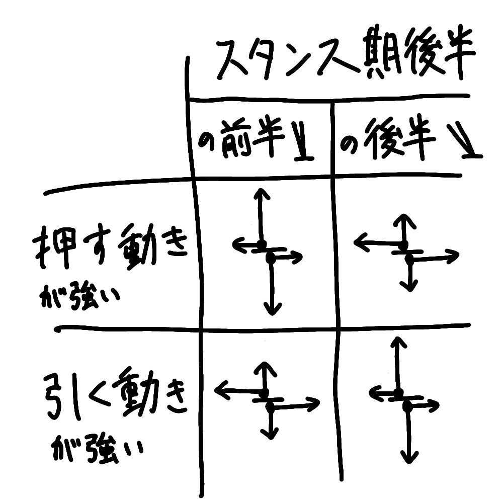 えーっと待って。整理するね。スタンス期前半は押す動きが強くて、スタンス期後半は引く動きが強い場合ってことか。