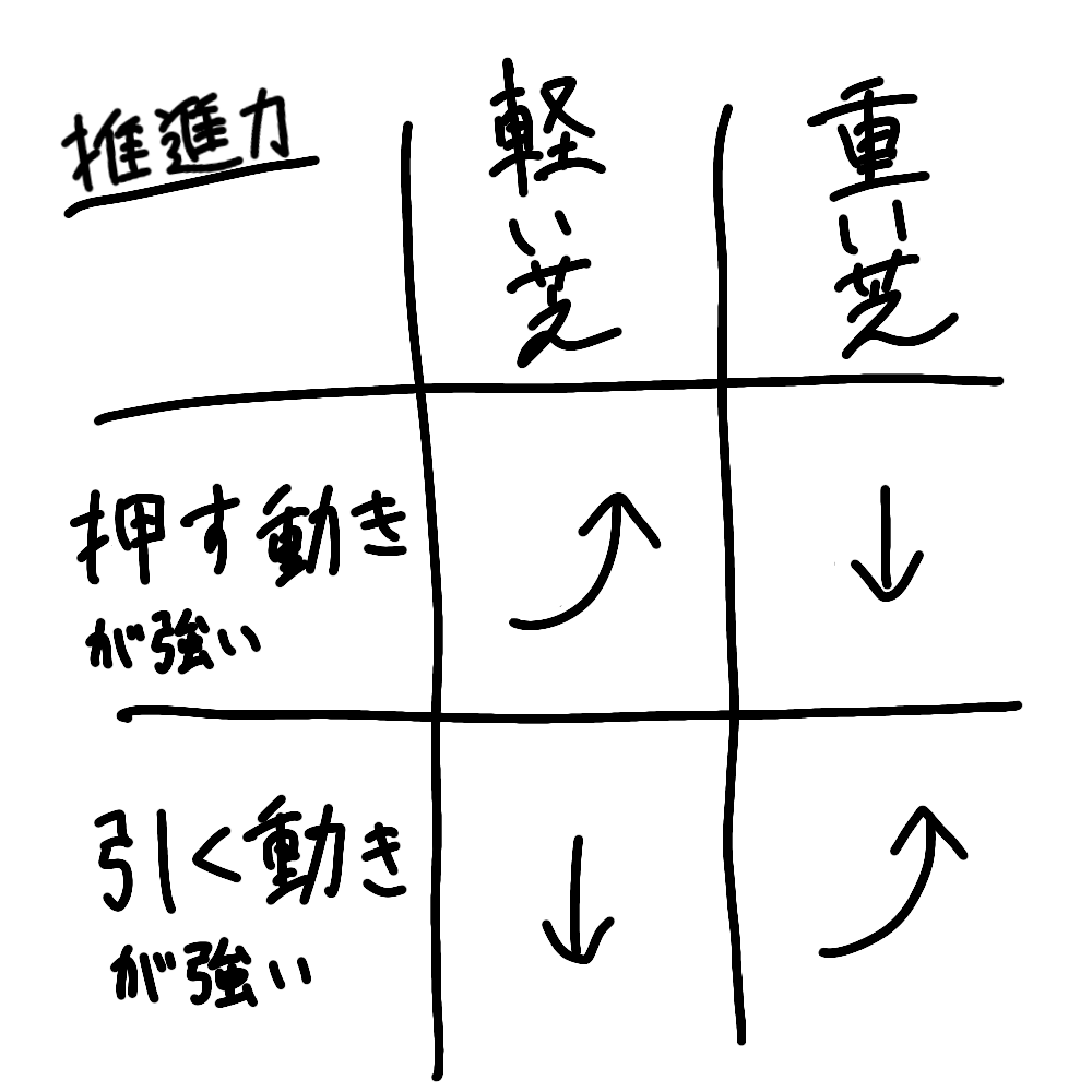軽い芝は押す動きね。