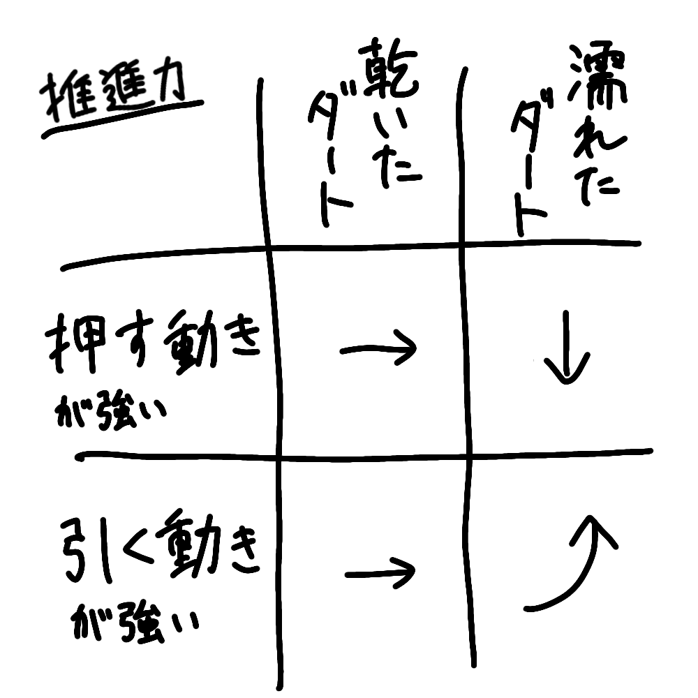 つまり、ダートの馬場は濡れるほど、引く動きの比率が高いと効率よく地面に力を加えられる馬場になるということです。
