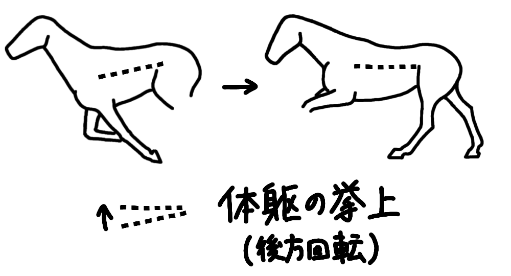 この回転に対抗するように、反手前後肢が着地する前から体躯は後方へ回転して、着地後に回転が止まります(挙上)。