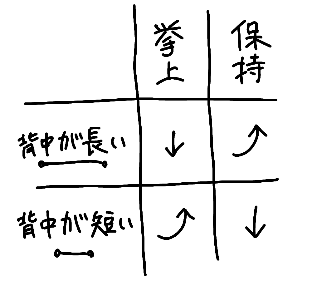 これは詳しく知りたい人向けの余談的な話ですが、挙上と保持どちらが強いかは背中のやわらかさと体躯の長さで決まります。