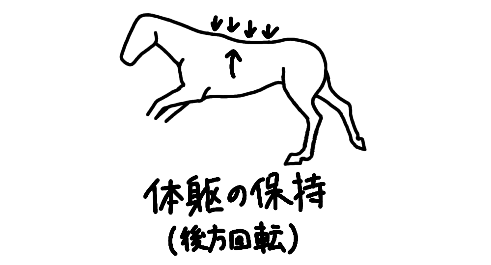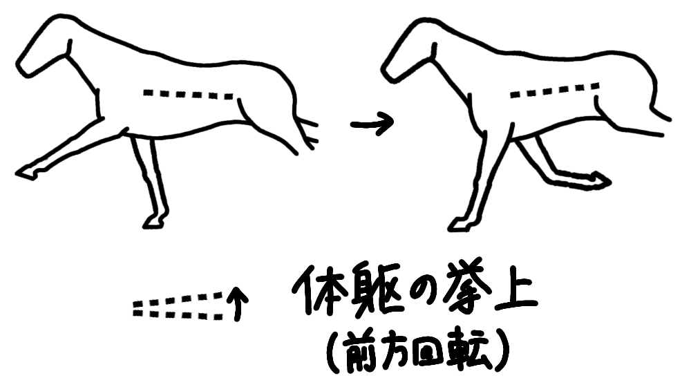 この回転に対抗するように、手前前肢が着地する前から体躯は前方へ回転して、着地後に回転が止まります(挙上)。