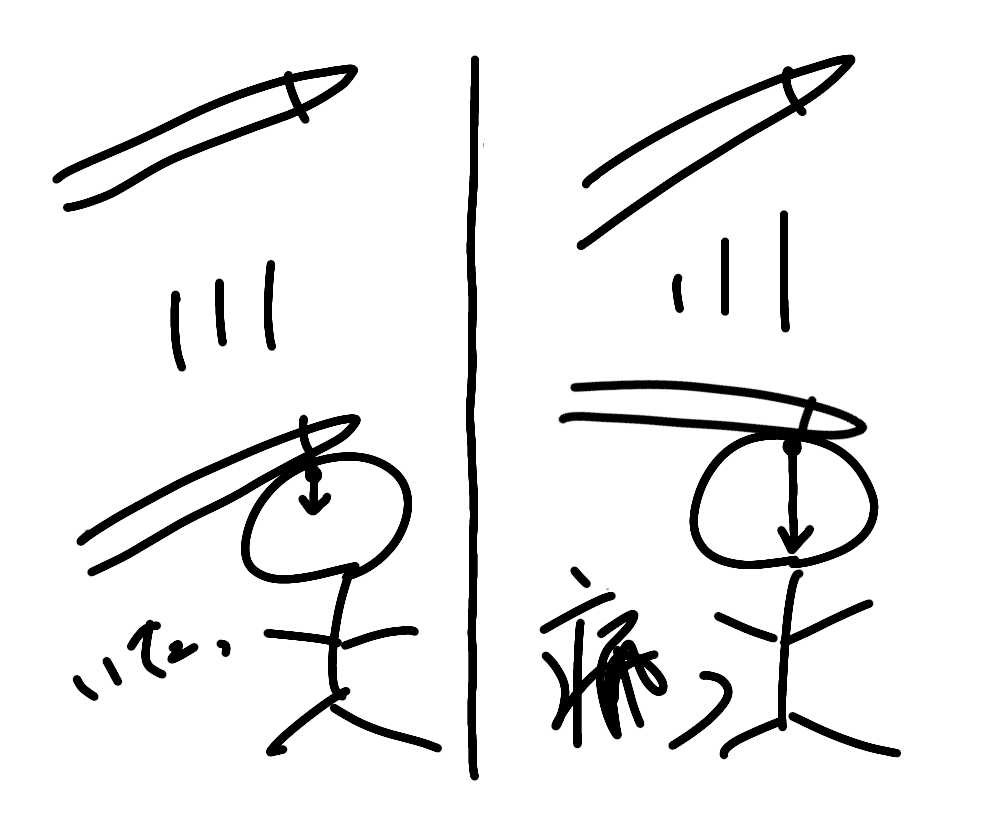 着地後に回転する力をかけるのは竹刀を上からグリグリされる場合を考える。片手持ちでグリグリされるよりも両手持ちでグリグリされる方が痛い。これは下に押さえつける力が増えるというのもあるが、回転の力が加わるから痛いんだ。