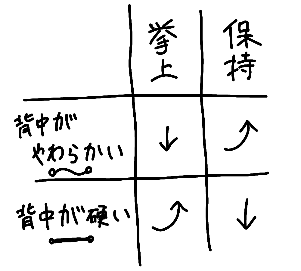 まず背中のやわらかさですが、やわらかいほど保持が強まり、挙上が弱まります。そして硬いほど挙上が強まり、保持が弱まります。