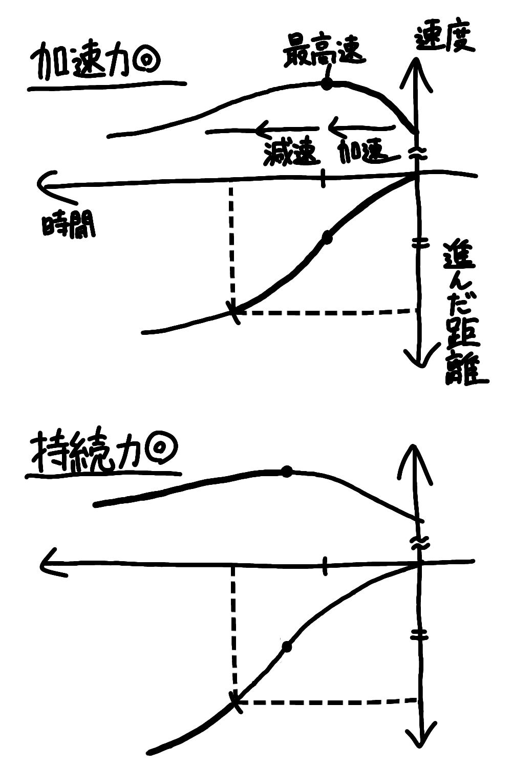 加速力は短い時間で速度を上げられる能力のことで、持続力は上がった速度が落ちにくい能力のことです。と言葉で説明しましたが、下のイメージがわかりやすいかもしれません。