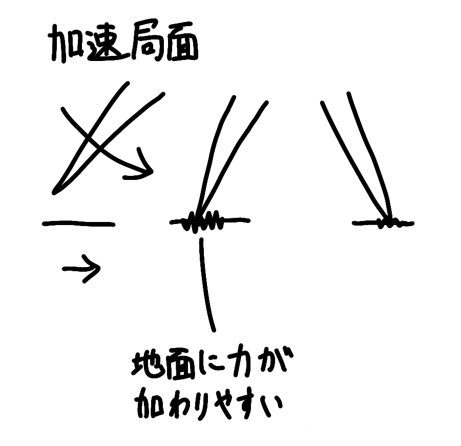 加速する局面では地面の速度は遅く、肢の速度は速くなっています。このときは、肢に力はかかりやすいけど肢の速度は出にくいという状態です。[パワー=力の強さ×動きの速さ]なので、この条件のときは力の強さが上がるよりも、動きの速さが上がる方がパワーは強くなります。