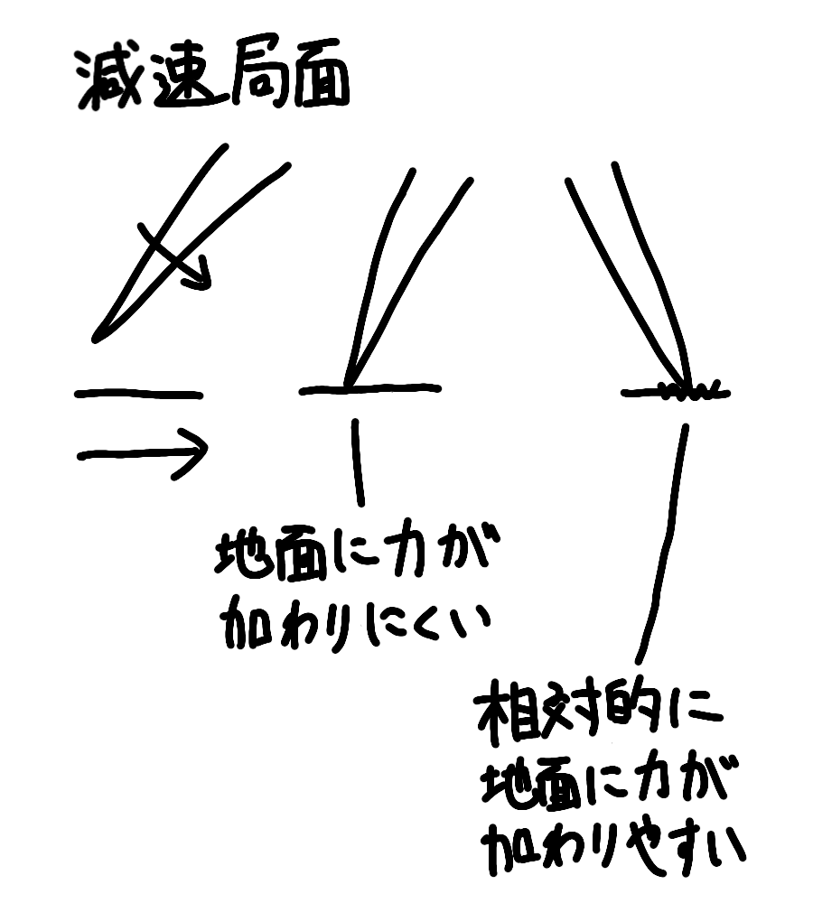 加速して最高速度に達した後減速する局面では、地面の速度は速く、肢の速度は遅くなっています。この条件のときは、スタンス期の遅い時期に負重しやすくなります。