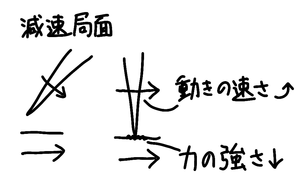 そして加速して最高速度に達した後減速する局面では、地面の速度は速く、肢の速度は遅くなっています。このときは、肢に力はかかりにくいけど肢の速度は出やすいという状態です。そしてこの条件のときは動きの速さが上がるよりも、力の強さが上がる方がパワーは強くなります。