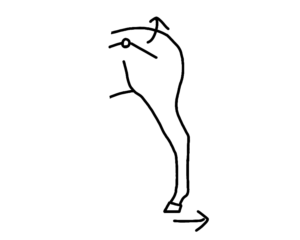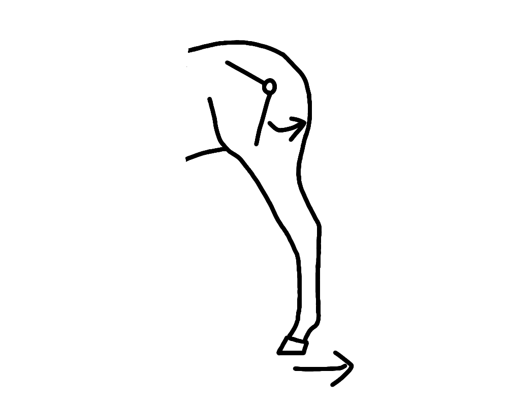 飛節、球節は後ろです。後肢全体で言うと、膝関節だけ仲間外れで前に行きます。前に行く関節を伸ばすということが上へのパワーにつながると考えています。