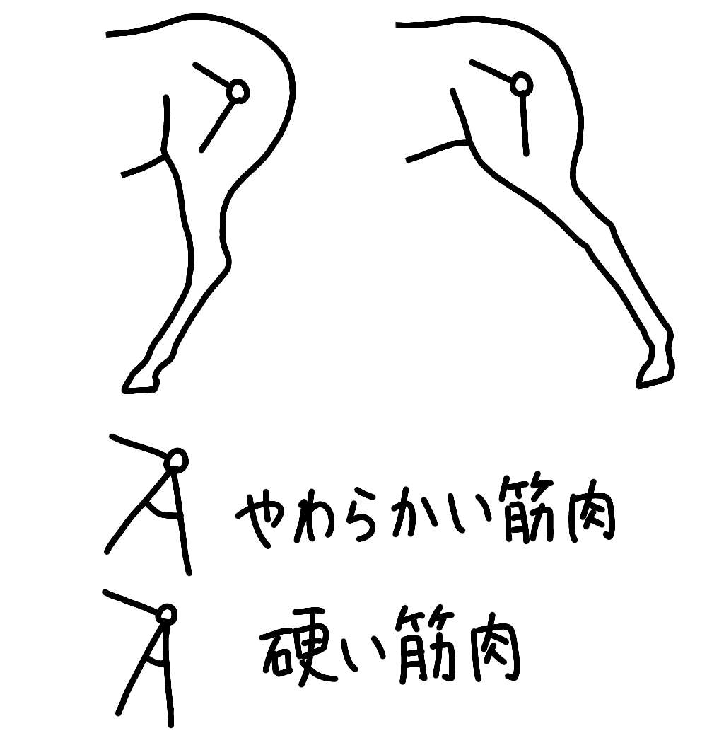 やわらかい筋肉は長く伸びて、硬い筋肉は長く伸びません。