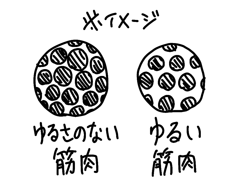 おっ、その通りだ。ゆるさがない筋肉は水分の少ないしっとりようかんで、ゆるい筋肉は水分を含んだプルプル水ようかんだ。