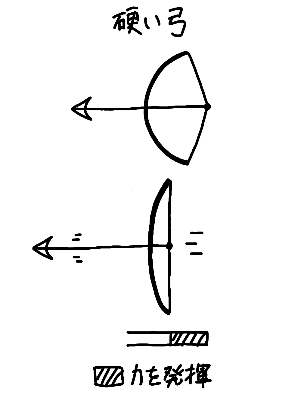 硬い弓はあまりしならず、引ききって手を離した後に、短い区間でしか矢に力を加えることができません。
