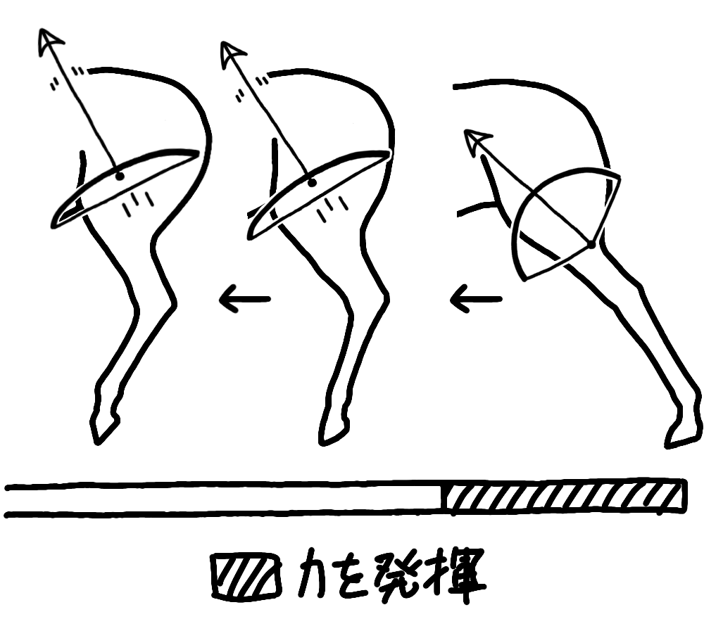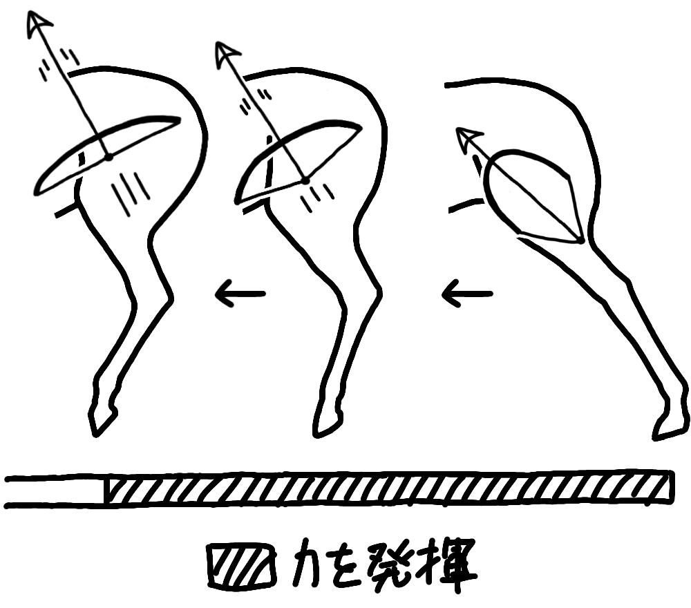 この弓矢を馬に落とし込みます。矢が後肢で、弓が股関節を曲げる筋肉、そして引き戻し期の最後の股関節が伸びきったとき(股関節を曲げる筋肉が伸びきったとき)が弓を引ききったとき、そこから手を離した後が振り出し期です。