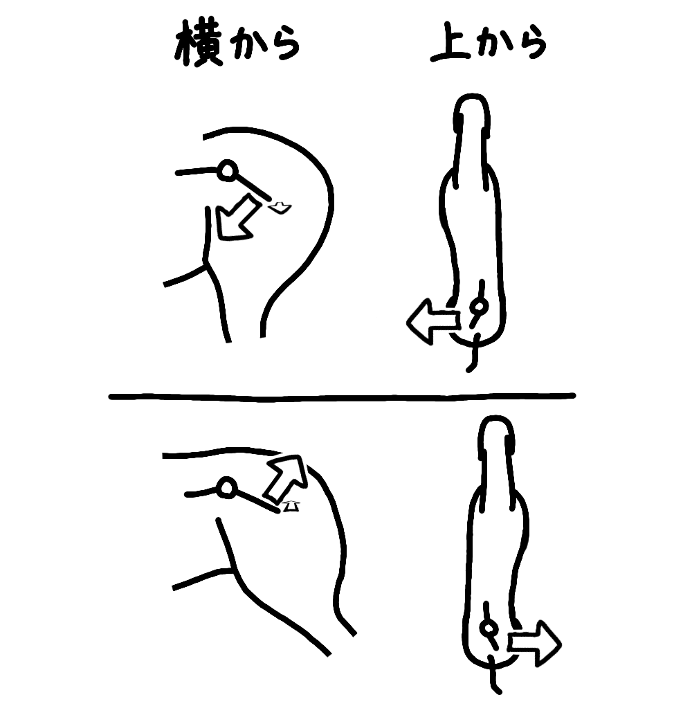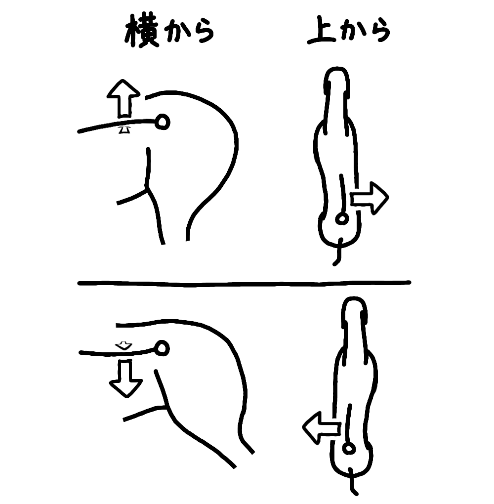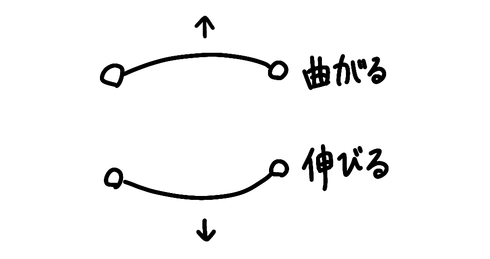 少し注意がいるのが、同時に左右方向にも曲がるということです。背中が曲がるときは、手前側にも曲がり、背中が伸びるときは反対側に曲がります。