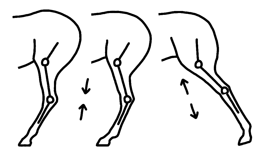 背中、腰仙関節、股関節の可動域の要素とは違い、膝関節と飛節はバネの要素です。