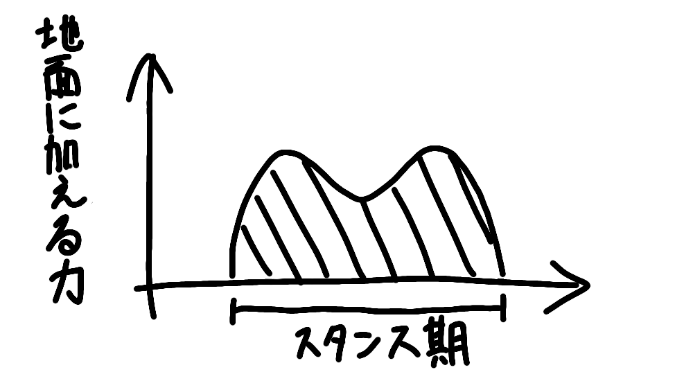 常歩のスタンス期前期(1つ目の山)の負重が、走るときのスタンス期前半の負重になり、常歩のスタンス期後期(2つ目の山)の負重が、走るときのスタンス期後半の負重になります。