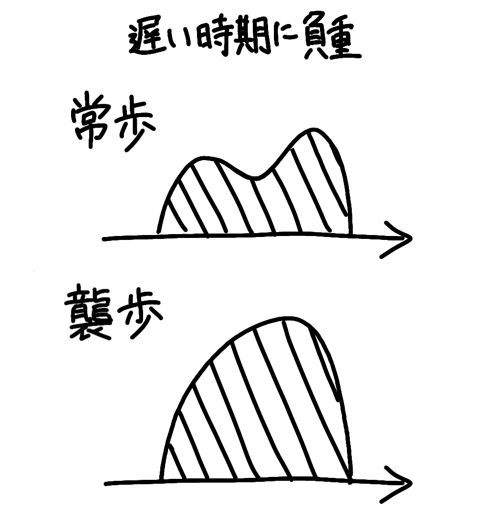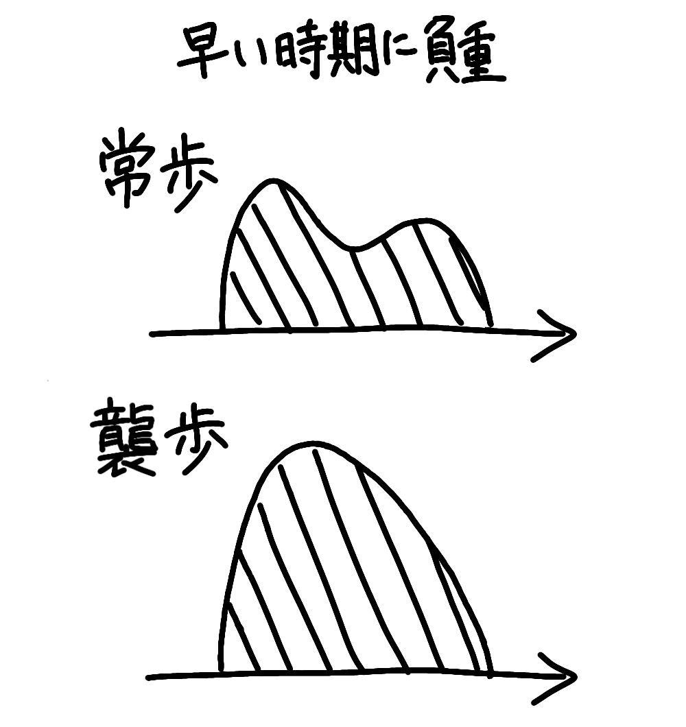 結局早い時期に負重する馬は早い時期に負重するし、遅い時期に負重する馬は遅い時期に負重する。歩くときでも走るときでもこれは変わらないからな。