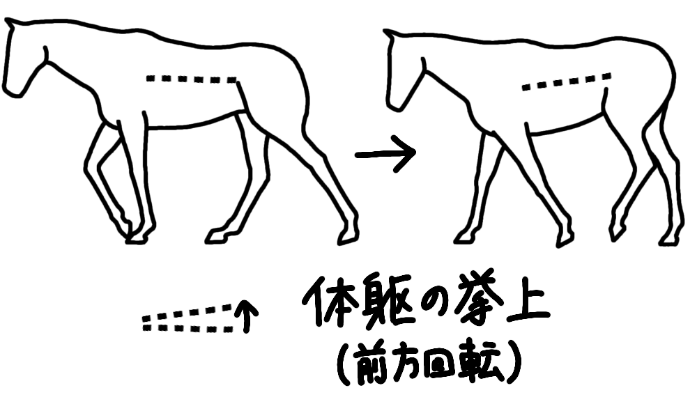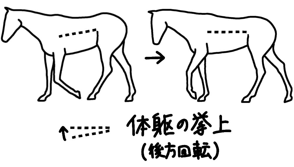 後肢の振り出し期後期~引き戻し期前期に、後方への回転の体躯の挙上と保持が起きます。