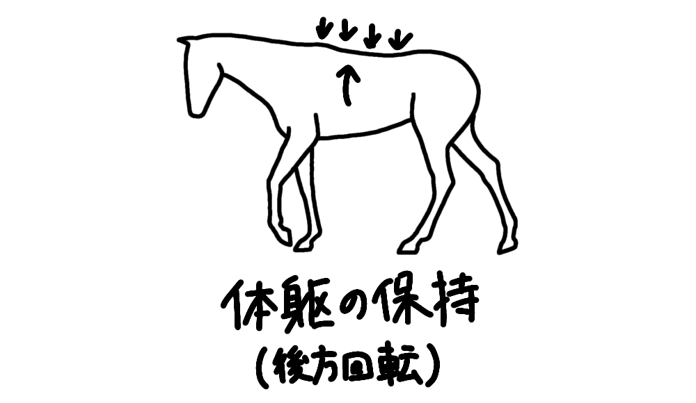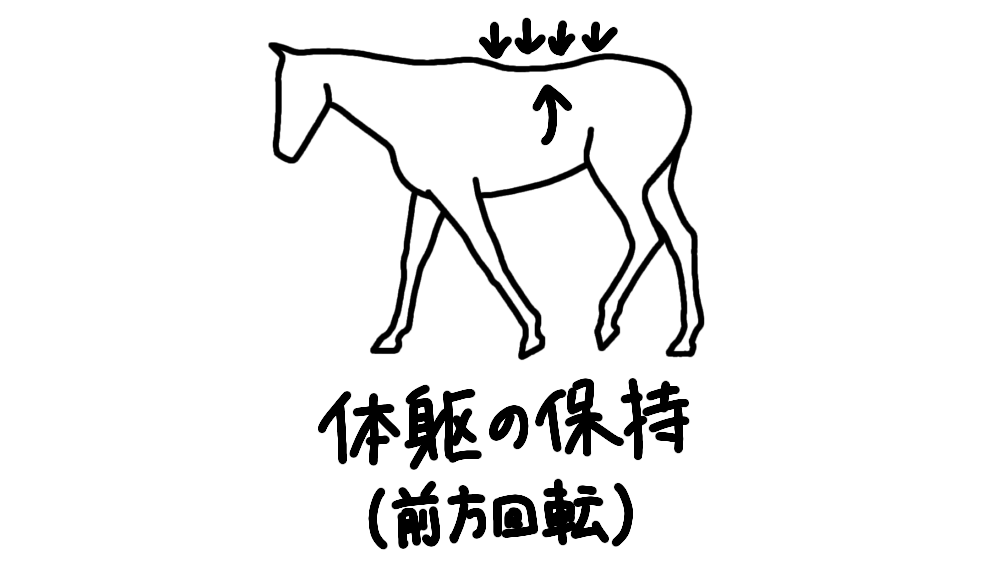走りでの体躯の挙上と保持が、前肢・後肢の地面に加える力を強くする作用があるように、常歩での体躯の挙上と保持も、常歩での前肢・後肢の地面に加える力を強くする作用があります。