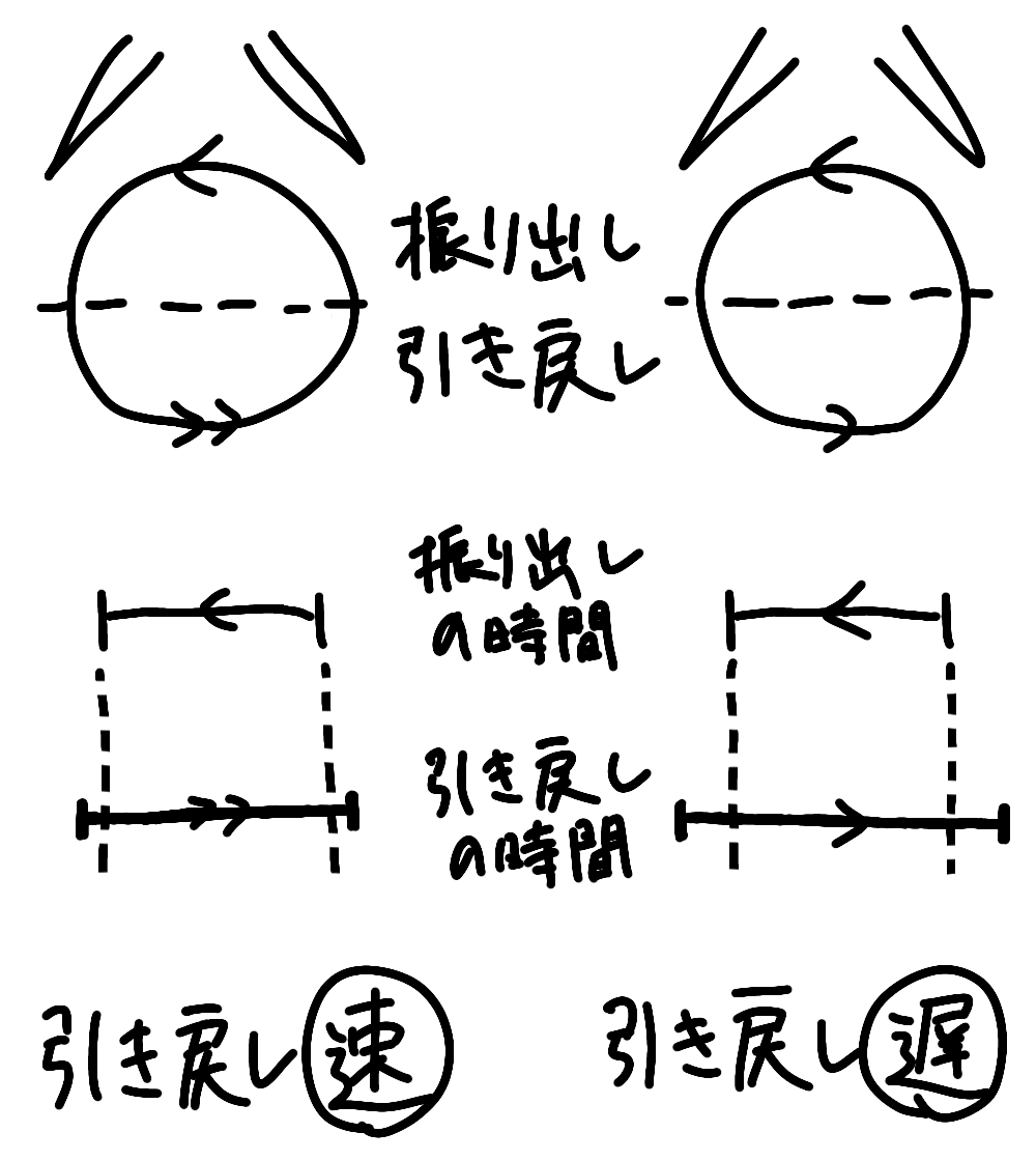 ただ、引き戻しの速さは歩きと走りとで連動しています。